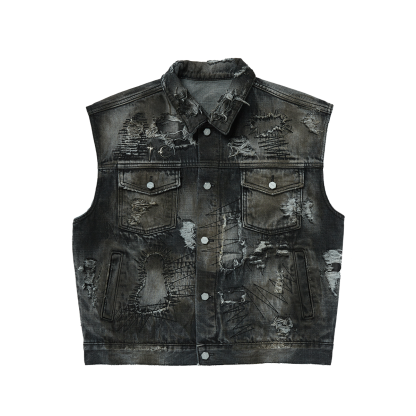 Hard-Washed Damaged Denim Vest