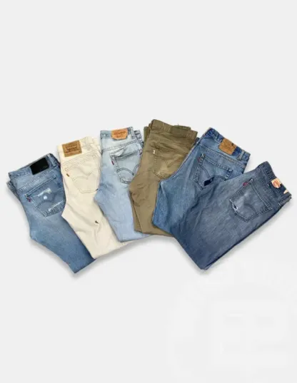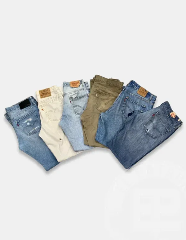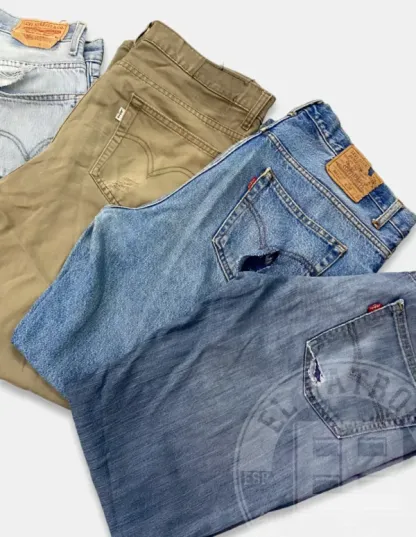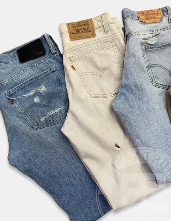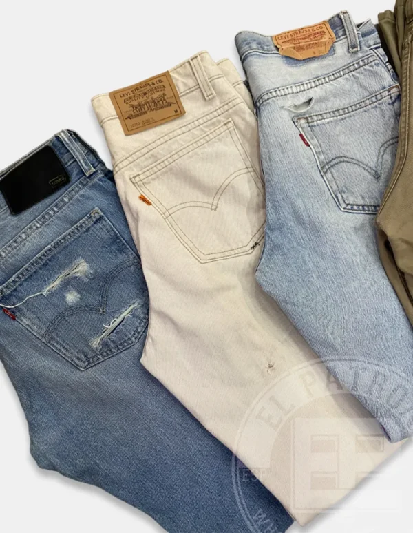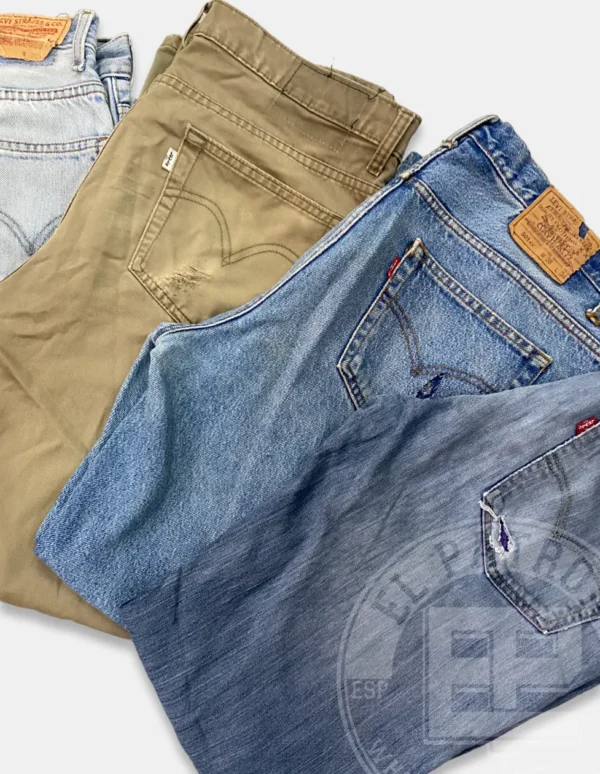 Pantalones Levi’s grado B. Posibilidad de manchas, descosidos o rotos. El mayor porcentaje de los jeans solamente están manchados. Una elección perfecta para realizar un proceso de limpieza y confección de los pantalones para posteriormente venderlos a muy buen precio. Perfectos para usar la tela para realizar bolsos, camisas, pantalones y mil cosas más.