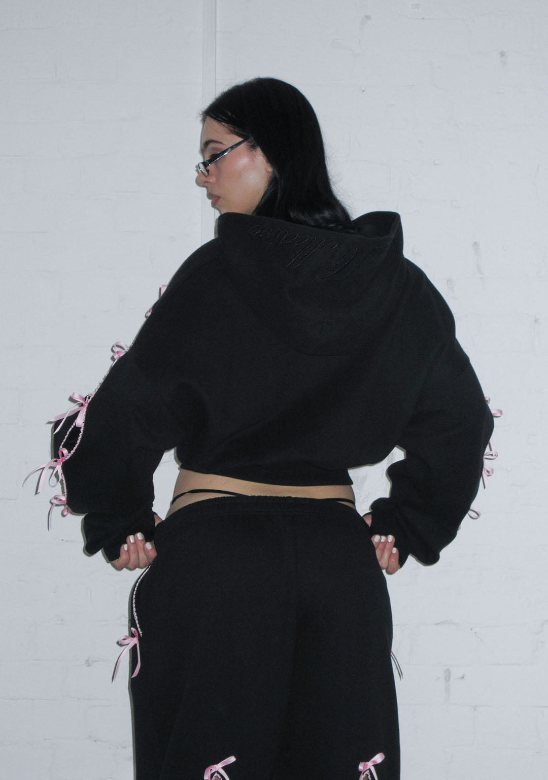 Orrienly™ PRINC355 RIBBON CROP ZIP HOODIE BLACK