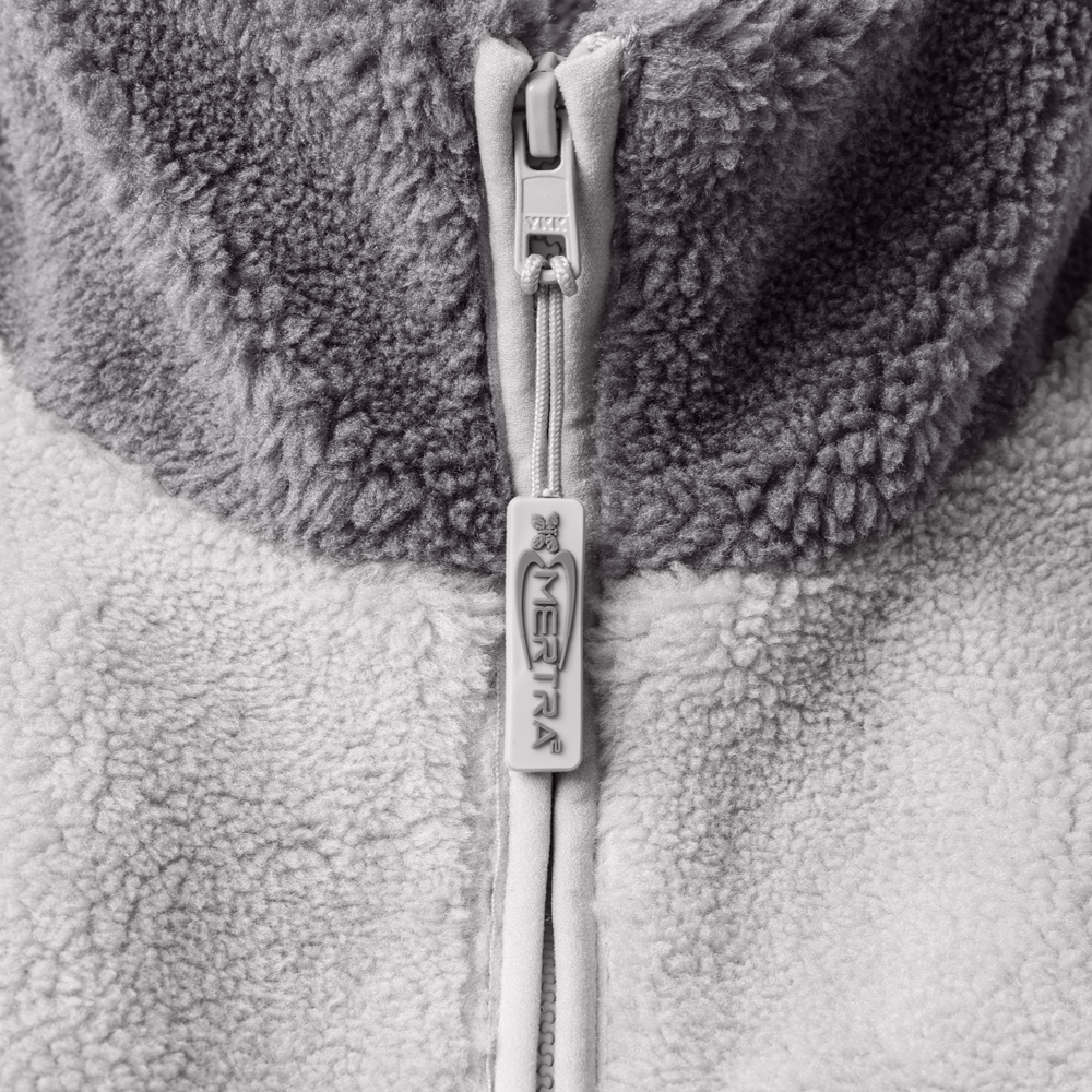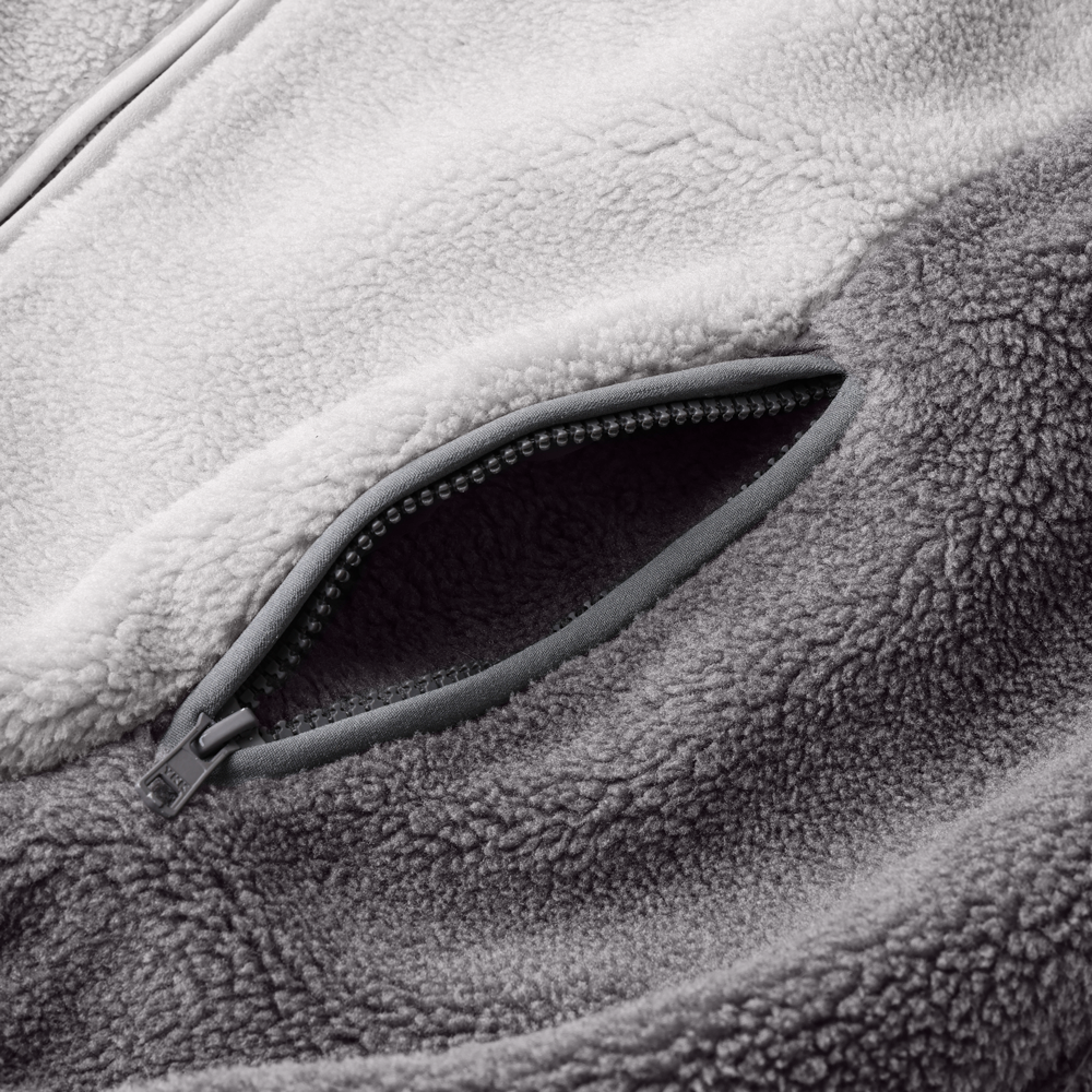 - Sherpa Fleece- Polyester lining- boxy fit- 2 tone fleece panelling- dyed leather patch on chest- rubber zipper pullers- chest zipper pocket